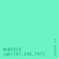Цвет #6BF3C5 в цветовой модели RGB обозначается тремя октетами (107, 243, 197) в десятичном формате и #6BF3C5 в шестнадцатиричном (hex) формате, которые являются интенсивностью красного 107 (hex 6B), интенсивность зелёного 243 (hex F3) и интенсивность синего 197 (hex C5).