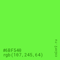 Цвет #6BF540 в цветовой модели RGB обозначается тремя октетами (107, 245, 64) в десятичном формате и #6BF540 в шестнадцатиричном (hex) формате, которые являются интенсивностью красного 107 (hex 6B), интенсивность зелёного 245 (hex F5) и интенсивность синего 64 (hex 40).