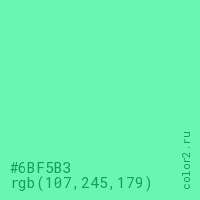 Цвет #6BF5B3 в цветовой модели RGB обозначается тремя октетами (107, 245, 179) в десятичном формате и #6BF5B3 в шестнадцатиричном (hex) формате, которые являются интенсивностью красного 107 (hex 6B), интенсивность зелёного 245 (hex F5) и интенсивность синего 179 (hex B3).