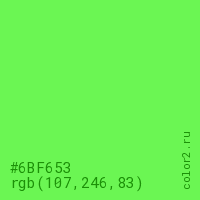 Цвет #6BF653 в цветовой модели RGB обозначается тремя октетами (107, 246, 83) в десятичном формате и #6BF653 в шестнадцатиричном (hex) формате, которые являются интенсивностью красного 107 (hex 6B), интенсивность зелёного 246 (hex F6) и интенсивность синего 83 (hex 53).