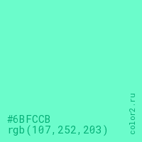 Цвет #6BFCCB в цветовой модели RGB обозначается тремя октетами (107, 252, 203) в десятичном формате и #6BFCCB в шестнадцатиричном (hex) формате, которые являются интенсивностью красного 107 (hex 6B), интенсивность зелёного 252 (hex FC) и интенсивность синего 203 (hex CB).