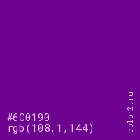 Цвет #6C0190 в цветовой модели RGB обозначается тремя октетами (108, 1, 144) в десятичном формате и #6C0190 в шестнадцатиричном (hex) формате, которые являются интенсивностью красного 108 (hex 6C), интенсивность зелёного 1 (hex 01) и интенсивность синего 144 (hex 90).