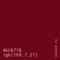 Цвет #6C071B в цветовой модели RGB обозначается тремя октетами (108, 7, 27) в десятичном формате и #6C071B в шестнадцатиричном (hex) формате, которые являются интенсивностью красного 108 (hex 6C), интенсивность зелёного 7 (hex 07) и интенсивность синего 27 (hex 1B).