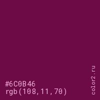 Цвет #6C0B46 в цветовой модели RGB обозначается тремя октетами (108, 11, 70) в десятичном формате и #6C0B46 в шестнадцатиричном (hex) формате, которые являются интенсивностью красного 108 (hex 6C), интенсивность зелёного 11 (hex 0B) и интенсивность синего 70 (hex 46).