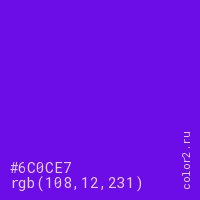 Цвет #6C0CE7 в цветовой модели RGB обозначается тремя октетами (108, 12, 231) в десятичном формате и #6C0CE7 в шестнадцатиричном (hex) формате, которые являются интенсивностью красного 108 (hex 6C), интенсивность зелёного 12 (hex 0C) и интенсивность синего 231 (hex E7).
