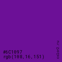 Цвет #6C1097 в цветовой модели RGB обозначается тремя октетами (108, 16, 151) в десятичном формате и #6C1097 в шестнадцатиричном (hex) формате, которые являются интенсивностью красного 108 (hex 6C), интенсивность зелёного 16 (hex 10) и интенсивность синего 151 (hex 97).