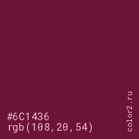 Цвет #6C1436 в цветовой модели RGB обозначается тремя октетами (108, 20, 54) в десятичном формате и #6C1436 в шестнадцатиричном (hex) формате, которые являются интенсивностью красного 108 (hex 6C), интенсивность зелёного 20 (hex 14) и интенсивность синего 54 (hex 36).