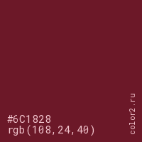 Цвет #6C1828 в цветовой модели RGB обозначается тремя октетами (108, 24, 40) в десятичном формате и #6C1828 в шестнадцатиричном (hex) формате, которые являются интенсивностью красного 108 (hex 6C), интенсивность зелёного 24 (hex 18) и интенсивность синего 40 (hex 28).