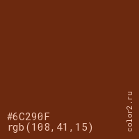 Цвет #6C290F в цветовой модели RGB обозначается тремя октетами (108, 41, 15) в десятичном формате и #6C290F в шестнадцатиричном (hex) формате, которые являются интенсивностью красного 108 (hex 6C), интенсивность зелёного 41 (hex 29) и интенсивность синего 15 (hex 0F).