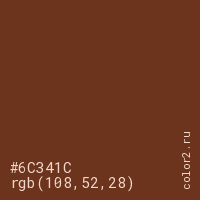 Цвет #6C341C в цветовой модели RGB обозначается тремя октетами (108, 52, 28) в десятичном формате и #6C341C в шестнадцатиричном (hex) формате, которые являются интенсивностью красного 108 (hex 6C), интенсивность зелёного 52 (hex 34) и интенсивность синего 28 (hex 1C).