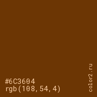 Цвет #6C3604 в цветовой модели RGB обозначается тремя октетами (108, 54, 4) в десятичном формате и #6C3604 в шестнадцатиричном (hex) формате, которые являются интенсивностью красного 108 (hex 6C), интенсивность зелёного 54 (hex 36) и интенсивность синего 4 (hex 04).