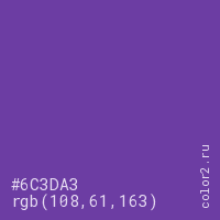 Цвет #6C3DA3 в цветовой модели RGB обозначается тремя октетами (108, 61, 163) в десятичном формате и #6C3DA3 в шестнадцатиричном (hex) формате, которые являются интенсивностью красного 108 (hex 6C), интенсивность зелёного 61 (hex 3D) и интенсивность синего 163 (hex A3).