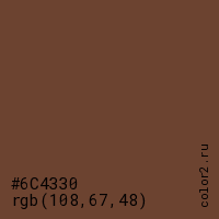 Цвет #6C4330 в цветовой модели RGB обозначается тремя октетами (108, 67, 48) в десятичном формате и #6C4330 в шестнадцатиричном (hex) формате, которые являются интенсивностью красного 108 (hex 6C), интенсивность зелёного 67 (hex 43) и интенсивность синего 48 (hex 30).