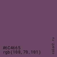 Цвет #6C4665 в цветовой модели RGB обозначается тремя октетами (108, 70, 101) в десятичном формате и #6C4665 в шестнадцатиричном (hex) формате, которые являются интенсивностью красного 108 (hex 6C), интенсивность зелёного 70 (hex 46) и интенсивность синего 101 (hex 65).
