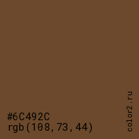 Цвет #6C492C в цветовой модели RGB обозначается тремя октетами (108, 73, 44) в десятичном формате и #6C492C в шестнадцатиричном (hex) формате, которые являются интенсивностью красного 108 (hex 6C), интенсивность зелёного 73 (hex 49) и интенсивность синего 44 (hex 2C).