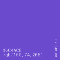 Цвет #6C4ACE в цветовой модели RGB обозначается тремя октетами (108, 74, 206) в десятичном формате и #6C4ACE в шестнадцатиричном (hex) формате, которые являются интенсивностью красного 108 (hex 6C), интенсивность зелёного 74 (hex 4A) и интенсивность синего 206 (hex CE).