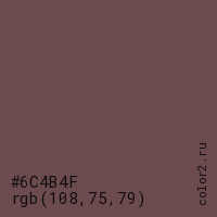 Цвет #6C4B4F в цветовой модели RGB обозначается тремя октетами (108, 75, 79) в десятичном формате и #6C4B4F в шестнадцатиричном (hex) формате, которые являются интенсивностью красного 108 (hex 6C), интенсивность зелёного 75 (hex 4B) и интенсивность синего 79 (hex 4F).