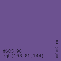 Цвет #6C5190 в цветовой модели RGB обозначается тремя октетами (108, 81, 144) в десятичном формате и #6C5190 в шестнадцатиричном (hex) формате, которые являются интенсивностью красного 108 (hex 6C), интенсивность зелёного 81 (hex 51) и интенсивность синего 144 (hex 90).