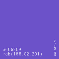 Цвет #6C52C9 в цветовой модели RGB обозначается тремя октетами (108, 82, 201) в десятичном формате и #6C52C9 в шестнадцатиричном (hex) формате, которые являются интенсивностью красного 108 (hex 6C), интенсивность зелёного 82 (hex 52) и интенсивность синего 201 (hex C9).