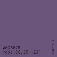Цвет #6C557B в цветовой модели RGB обозначается тремя октетами (108, 85, 123) в десятичном формате и #6C557B в шестнадцатиричном (hex) формате, которые являются интенсивностью красного 108 (hex 6C), интенсивность зелёного 85 (hex 55) и интенсивность синего 123 (hex 7B).