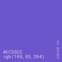Цвет #6C55CC в цветовой модели RGB обозначается тремя октетами (108, 85, 204) в десятичном формате и #6C55CC в шестнадцатиричном (hex) формате, которые являются интенсивностью красного 108 (hex 6C), интенсивность зелёного 85 (hex 55) и интенсивность синего 204 (hex CC).