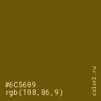 Цвет #6C5609 в цветовой модели RGB обозначается тремя октетами (108, 86, 9) в десятичном формате и #6C5609 в шестнадцатиричном (hex) формате, которые являются интенсивностью красного 108 (hex 6C), интенсивность зелёного 86 (hex 56) и интенсивность синего 9 (hex 09).