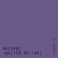 Цвет #6C598C в цветовой модели RGB обозначается тремя октетами (108, 89, 140) в десятичном формате и #6C598C в шестнадцатиричном (hex) формате, которые являются интенсивностью красного 108 (hex 6C), интенсивность зелёного 89 (hex 59) и интенсивность синего 140 (hex 8C).