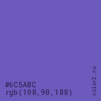 Цвет #6C5ABC в цветовой модели RGB обозначается тремя октетами (108, 90, 188) в десятичном формате и #6C5ABC в шестнадцатиричном (hex) формате, которые являются интенсивностью красного 108 (hex 6C), интенсивность зелёного 90 (hex 5A) и интенсивность синего 188 (hex BC).