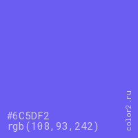 Цвет #6C5DF2 в цветовой модели RGB обозначается тремя октетами (108, 93, 242) в десятичном формате и #6C5DF2 в шестнадцатиричном (hex) формате, которые являются интенсивностью красного 108 (hex 6C), интенсивность зелёного 93 (hex 5D) и интенсивность синего 242 (hex F2).