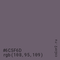 Цвет #6C5F6D в цветовой модели RGB обозначается тремя октетами (108, 95, 109) в десятичном формате и #6C5F6D в шестнадцатиричном (hex) формате, которые являются интенсивностью красного 108 (hex 6C), интенсивность зелёного 95 (hex 5F) и интенсивность синего 109 (hex 6D).