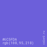 Цвет #6C5FDA в цветовой модели RGB обозначается тремя октетами (108, 95, 218) в десятичном формате и #6C5FDA в шестнадцатиричном (hex) формате, которые являются интенсивностью красного 108 (hex 6C), интенсивность зелёного 95 (hex 5F) и интенсивность синего 218 (hex DA).