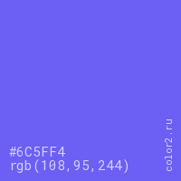 Цвет #6C5FF4 в цветовой модели RGB обозначается тремя октетами (108, 95, 244) в десятичном формате и #6C5FF4 в шестнадцатиричном (hex) формате, которые являются интенсивностью красного 108 (hex 6C), интенсивность зелёного 95 (hex 5F) и интенсивность синего 244 (hex F4).