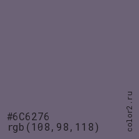 Цвет #6C6276 в цветовой модели RGB обозначается тремя октетами (108, 98, 118) в десятичном формате и #6C6276 в шестнадцатиричном (hex) формате, которые являются интенсивностью красного 108 (hex 6C), интенсивность зелёного 98 (hex 62) и интенсивность синего 118 (hex 76).