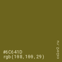 Цвет #6C641D в цветовой модели RGB обозначается тремя октетами (108, 100, 29) в десятичном формате и #6C641D в шестнадцатиричном (hex) формате, которые являются интенсивностью красного 108 (hex 6C), интенсивность зелёного 100 (hex 64) и интенсивность синего 29 (hex 1D).