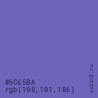 Цвет #6C65BA в цветовой модели RGB обозначается тремя октетами (108, 101, 186) в десятичном формате и #6C65BA в шестнадцатиричном (hex) формате, которые являются интенсивностью красного 108 (hex 6C), интенсивность зелёного 101 (hex 65) и интенсивность синего 186 (hex BA).