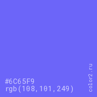 Цвет #6C65F9 в цветовой модели RGB обозначается тремя октетами (108, 101, 249) в десятичном формате и #6C65F9 в шестнадцатиричном (hex) формате, которые являются интенсивностью красного 108 (hex 6C), интенсивность зелёного 101 (hex 65) и интенсивность синего 249 (hex F9).