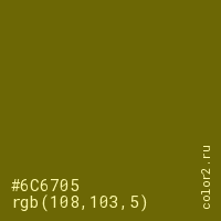 Цвет #6C6705 в цветовой модели RGB обозначается тремя октетами (108, 103, 5) в десятичном формате и #6C6705 в шестнадцатиричном (hex) формате, которые являются интенсивностью красного 108 (hex 6C), интенсивность зелёного 103 (hex 67) и интенсивность синего 5 (hex 05).