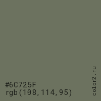 Цвет #6C725F в цветовой модели RGB обозначается тремя октетами (108, 114, 95) в десятичном формате и #6C725F в шестнадцатиричном (hex) формате, которые являются интенсивностью красного 108 (hex 6C), интенсивность зелёного 114 (hex 72) и интенсивность синего 95 (hex 5F).