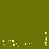 Цвет #6C7303 в цветовой модели RGB обозначается тремя октетами (108, 115, 3) в десятичном формате и #6C7303 в шестнадцатиричном (hex) формате, которые являются интенсивностью красного 108 (hex 6C), интенсивность зелёного 115 (hex 73) и интенсивность синего 3 (hex 03).