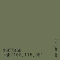 Цвет #6C7356 в цветовой модели RGB обозначается тремя октетами (108, 115, 86) в десятичном формате и #6C7356 в шестнадцатиричном (hex) формате, которые являются интенсивностью красного 108 (hex 6C), интенсивность зелёного 115 (hex 73) и интенсивность синего 86 (hex 56).