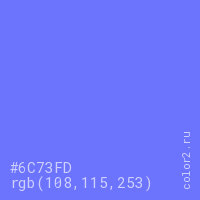 Цвет #6C73FD в цветовой модели RGB обозначается тремя октетами (108, 115, 253) в десятичном формате и #6C73FD в шестнадцатиричном (hex) формате, которые являются интенсивностью красного 108 (hex 6C), интенсивность зелёного 115 (hex 73) и интенсивность синего 253 (hex FD).