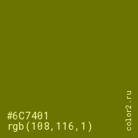Цвет #6C7401 в цветовой модели RGB обозначается тремя октетами (108, 116, 1) в десятичном формате и #6C7401 в шестнадцатиричном (hex) формате, которые являются интенсивностью красного 108 (hex 6C), интенсивность зелёного 116 (hex 74) и интенсивность синего 1 (hex 01).