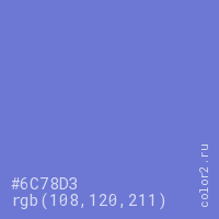Цвет #6C78D3 в цветовой модели RGB обозначается тремя октетами (108, 120, 211) в десятичном формате и #6C78D3 в шестнадцатиричном (hex) формате, которые являются интенсивностью красного 108 (hex 6C), интенсивность зелёного 120 (hex 78) и интенсивность синего 211 (hex D3).
