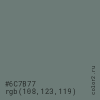Цвет #6C7B77 в цветовой модели RGB обозначается тремя октетами (108, 123, 119) в десятичном формате и #6C7B77 в шестнадцатиричном (hex) формате, которые являются интенсивностью красного 108 (hex 6C), интенсивность зелёного 123 (hex 7B) и интенсивность синего 119 (hex 77).