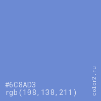 Цвет #6C8AD3 в цветовой модели RGB обозначается тремя октетами (108, 138, 211) в десятичном формате и #6C8AD3 в шестнадцатиричном (hex) формате, которые являются интенсивностью красного 108 (hex 6C), интенсивность зелёного 138 (hex 8A) и интенсивность синего 211 (hex D3).