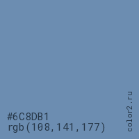 Цвет #6C8DB1 в цветовой модели RGB обозначается тремя октетами (108, 141, 177) в десятичном формате и #6C8DB1 в шестнадцатиричном (hex) формате, которые являются интенсивностью красного 108 (hex 6C), интенсивность зелёного 141 (hex 8D) и интенсивность синего 177 (hex B1).