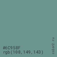 Цвет #6C958F в цветовой модели RGB обозначается тремя октетами (108, 149, 143) в десятичном формате и #6C958F в шестнадцатиричном (hex) формате, которые являются интенсивностью красного 108 (hex 6C), интенсивность зелёного 149 (hex 95) и интенсивность синего 143 (hex 8F).