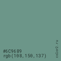 Цвет #6C9689 в цветовой модели RGB обозначается тремя октетами (108, 150, 137) в десятичном формате и #6C9689 в шестнадцатиричном (hex) формате, которые являются интенсивностью красного 108 (hex 6C), интенсивность зелёного 150 (hex 96) и интенсивность синего 137 (hex 89).
