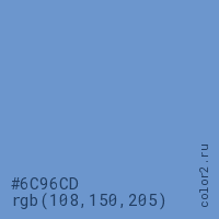 Цвет #6C96CD в цветовой модели RGB обозначается тремя октетами (108, 150, 205) в десятичном формате и #6C96CD в шестнадцатиричном (hex) формате, которые являются интенсивностью красного 108 (hex 6C), интенсивность зелёного 150 (hex 96) и интенсивность синего 205 (hex CD).