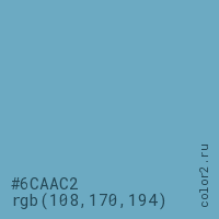 Цвет #6CAAC2 в цветовой модели RGB обозначается тремя октетами (108, 170, 194) в десятичном формате и #6CAAC2 в шестнадцатиричном (hex) формате, которые являются интенсивностью красного 108 (hex 6C), интенсивность зелёного 170 (hex AA) и интенсивность синего 194 (hex C2).
